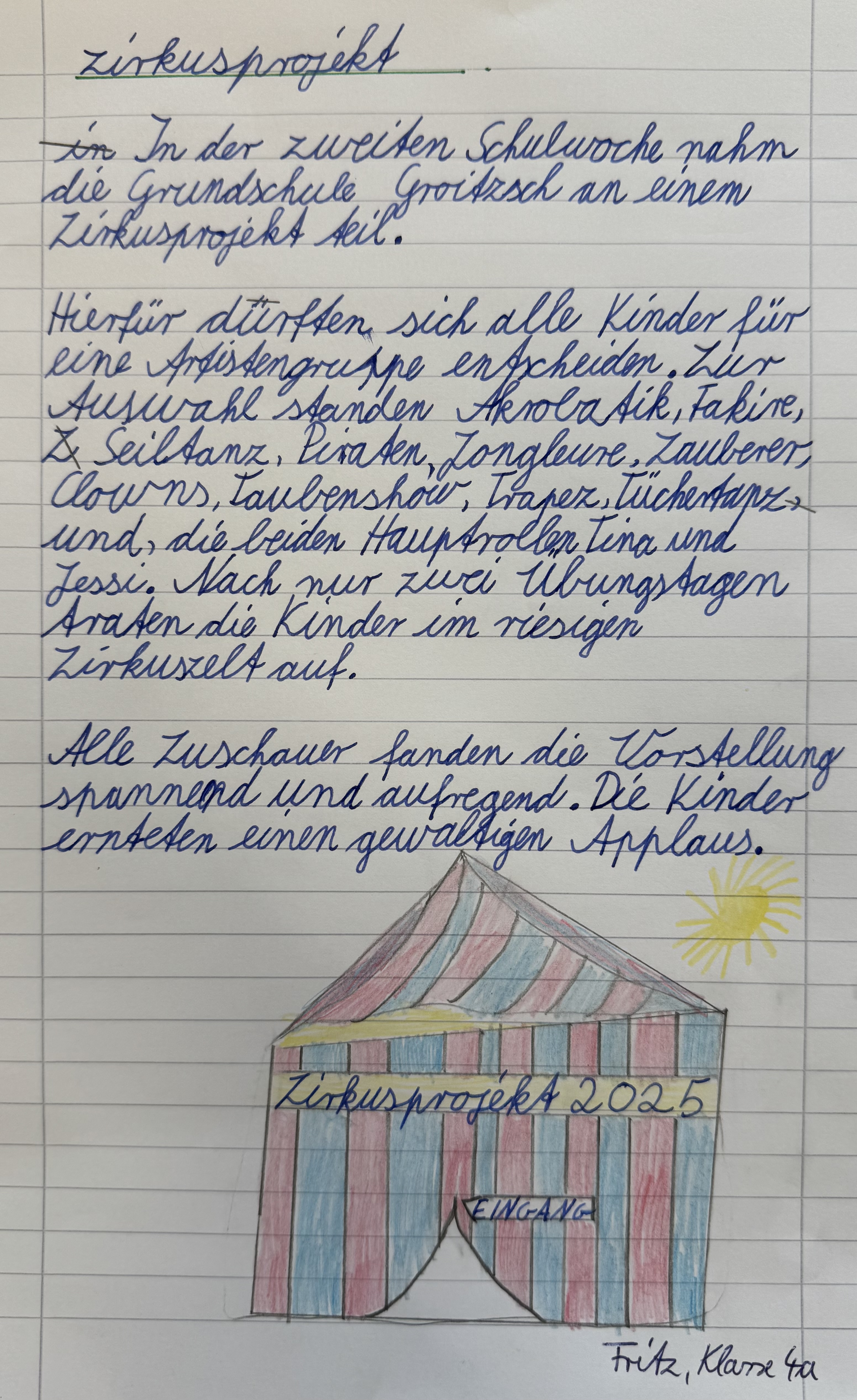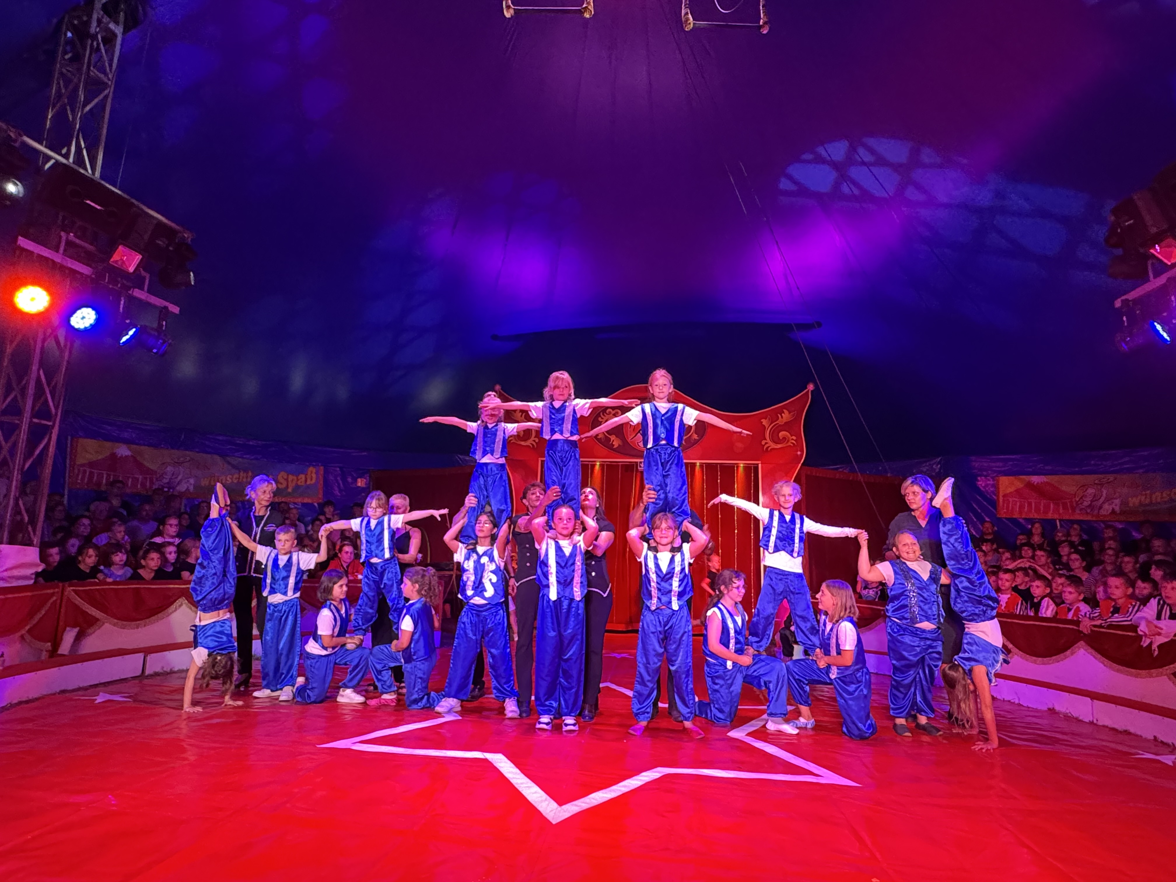 In der Woche vom 18.08. bis 22.08.2025 stand unsere Schule ganz im Zeichen des Zirkus. Gemeinsam mit einem professionellen Zirkusteam erarbeiteten die Schülerinnen und Schüler verschiedene Darbietungen – von Jonglage und Clownerie über Akrobatik, Zauberei und Feuershow bis hin zum Seiltanz. Zudem gab es viel Wissenswertes rund um das Leben und Arbeiten in einem Zirkus zu erfahren. Mit viel Einsatz, Mut und Freude gelang es den Kindern, ihr Können in großen Abschlussvorstellungen eindrucksvoll zu präsentieren. Die Aufführung im Zirkuszelt war für alle Beteiligten ein unvergessliches Erlebnis. Die Begeisterung des Publikums und der kräftige Applaus machten die Kinder sichtbar stolz auf ihre Leistungen.